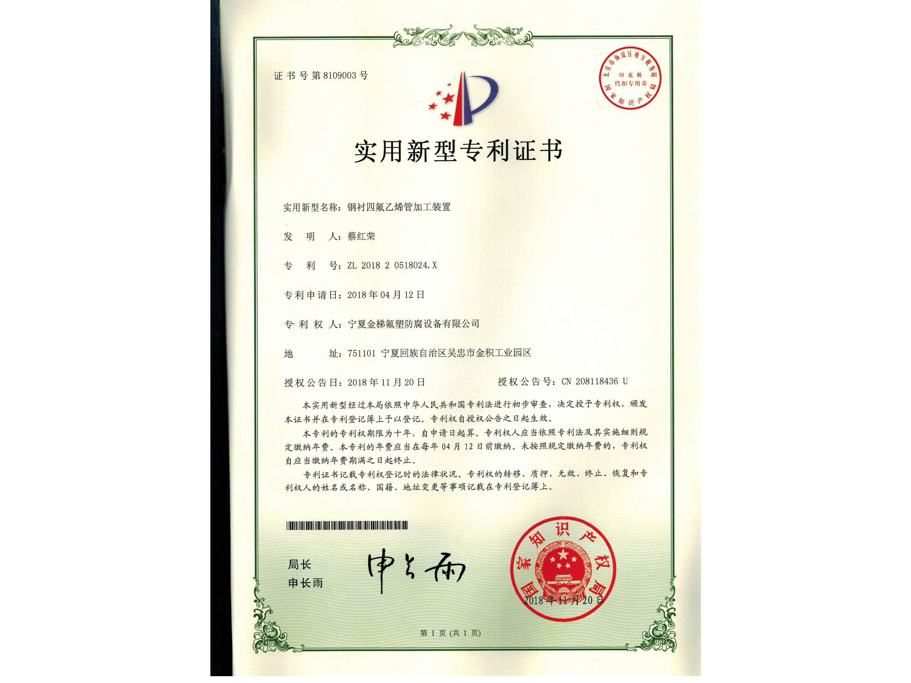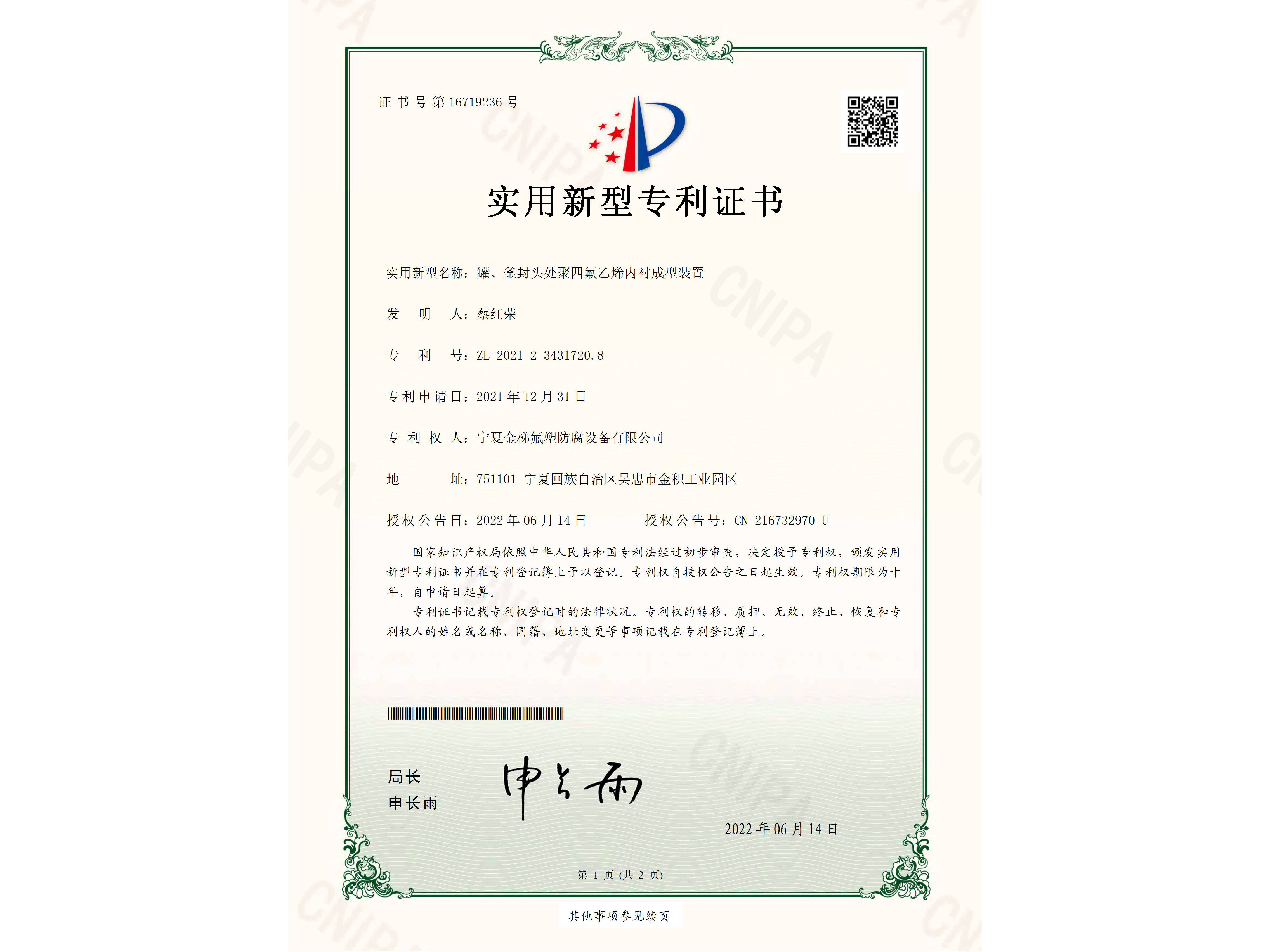 罐、釜封头处聚四氟乙烯内衬成型装置--电子证书