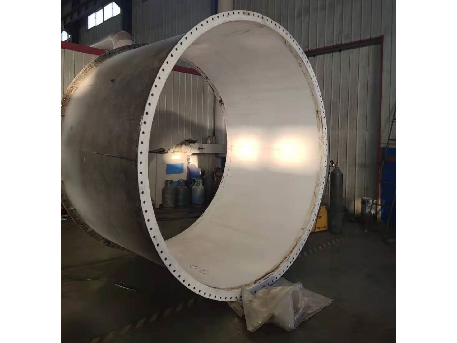 本公司以研发耐强酸、耐高温高压的高性能钢衬四氟设备防腐设备制造工艺为核心,针对不同类型钢结构件,采用不同衬里成型工艺技术,理论探索衬里成型机理,指导细化每一工艺步骤关键。对钢衬四氟防腐设备钢结构外壳明确提出结构特殊设计要求,运用焊带搭接焊接法,严格加强四氟衬里整体焊接成型,采用聚四氟乙烯表面活化技术和衬装耐高温粘接技术,实现了大型部件操作方便快捷、质量安全可靠的紧衬工艺;对管件等复杂结构钢衬聚四氟乙烯进行了优化设计改进;实践探索了等压成型预压操作压力时间控制和烧结工艺曲线具体先进数据,产品具备如下优势: