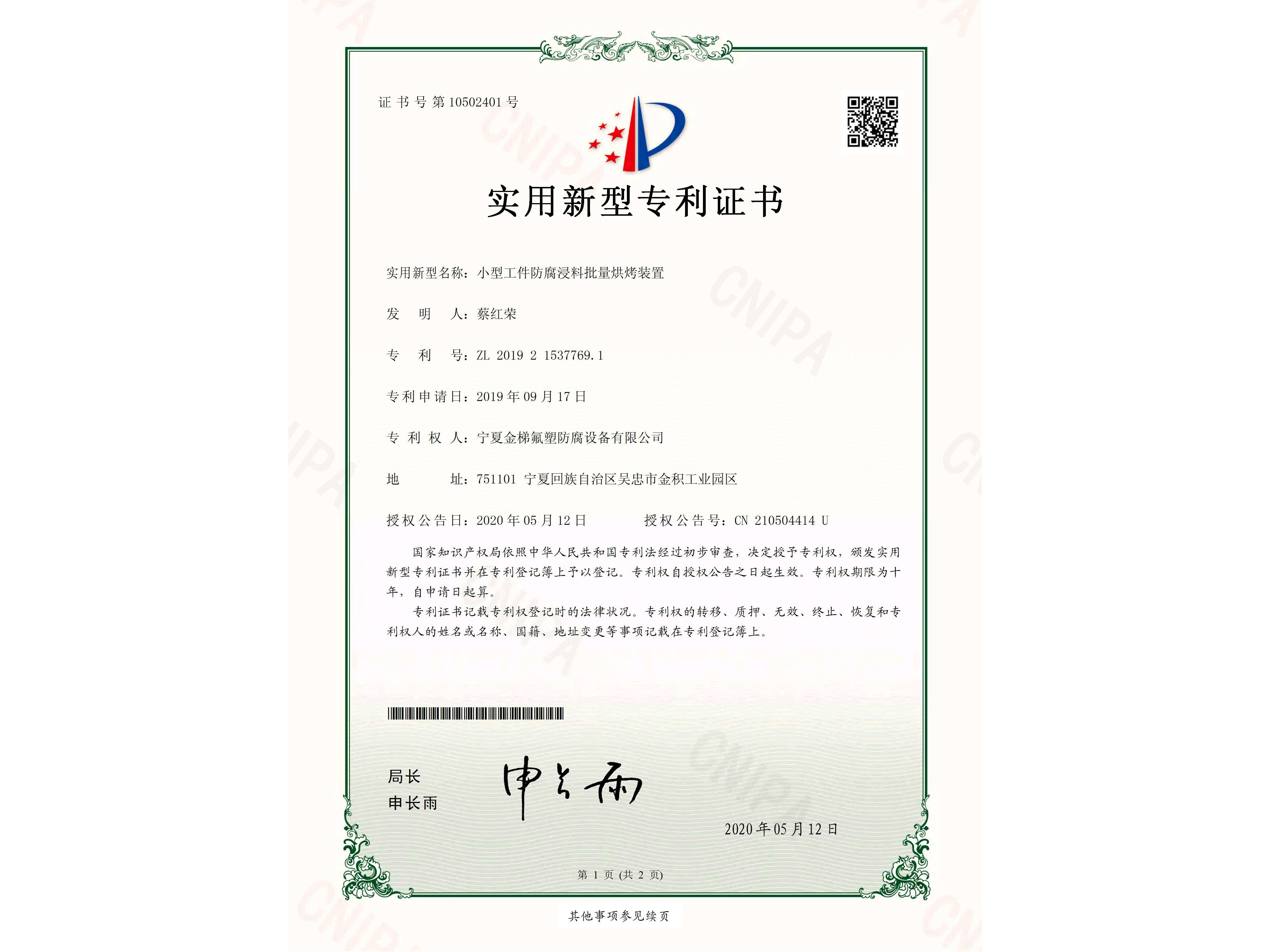 首页    实用新型专利    2017-2021年专利    小型工件防腐浸料批量烘烤装置--实用新型专利证书